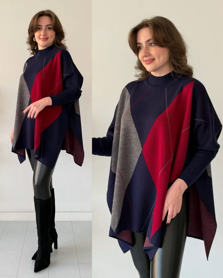 This color block knit poncho is crafted to keep you warm and stylish all winter long.